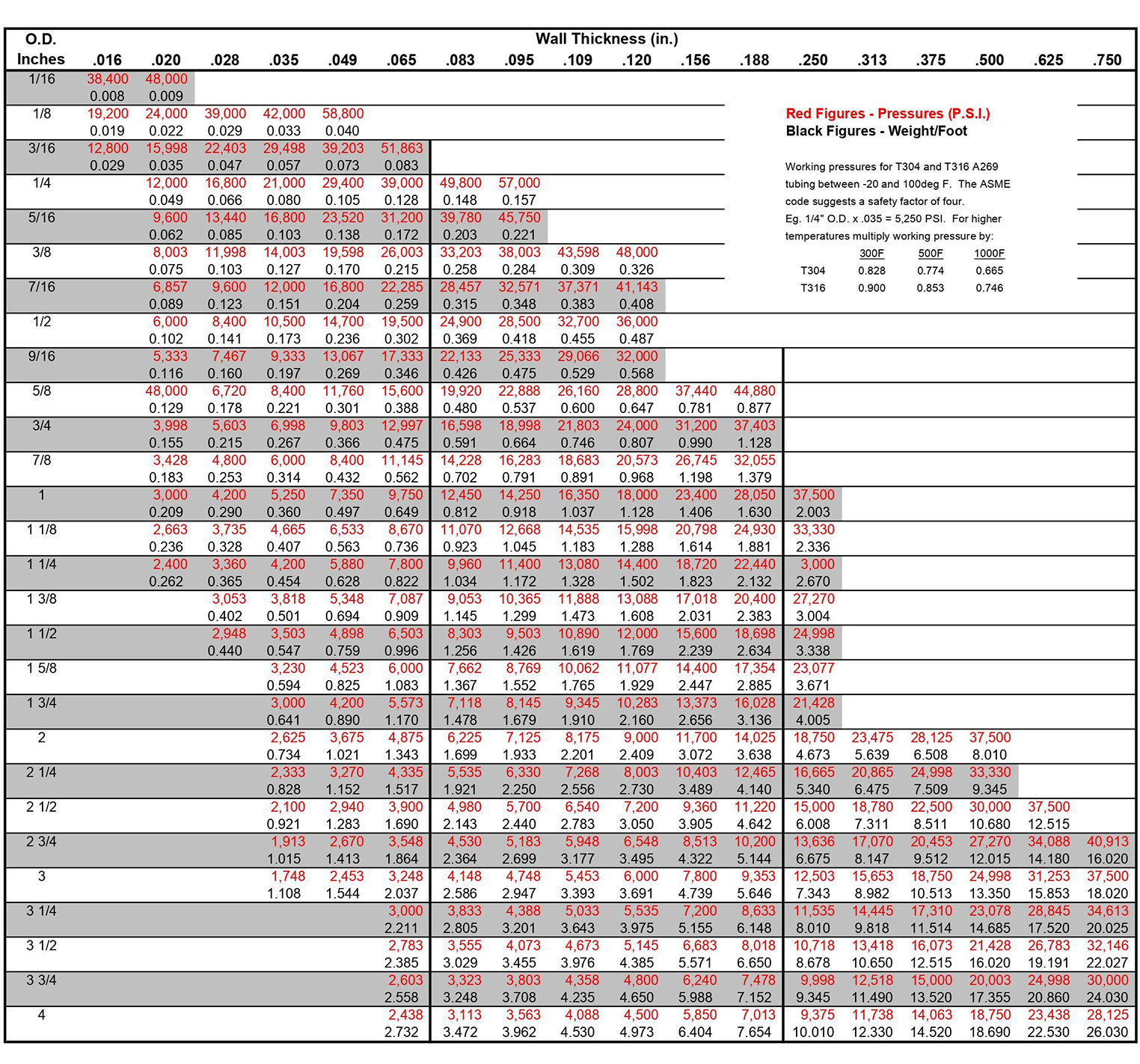 스테인리스 튜브 이론적 버스트 압력 및 무게